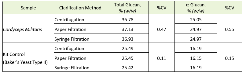 Importantly, all three clarification techniques are compatible with both total glucan and α-glucan methodologies in K-YBGL. Their applicability across these assays provides flexibility in method use and adaptation to different sample types or throughput requirements. The choice of clarification method may depend on the specific characteristics of the sample matrix, the required level of clarity, and practical considerations such as time constraints and equipment availability.